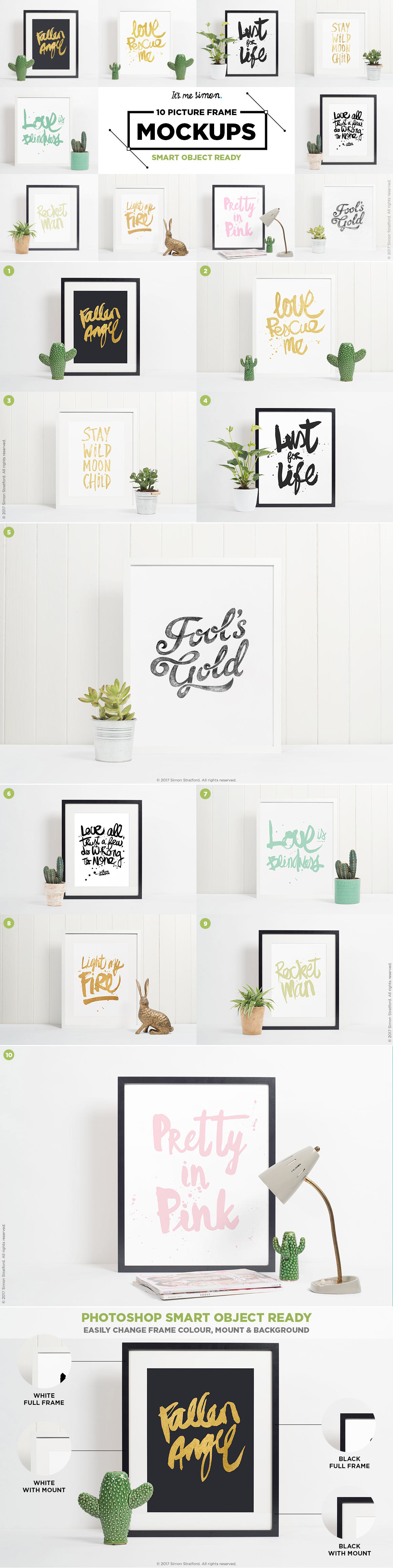 10 picture frame mockups is a photo frame kit for photoshop. Gorgeously photographed in my home studio it enables you to easily mock-up your designs into a simple but stylish scene—in just a few clicks.
