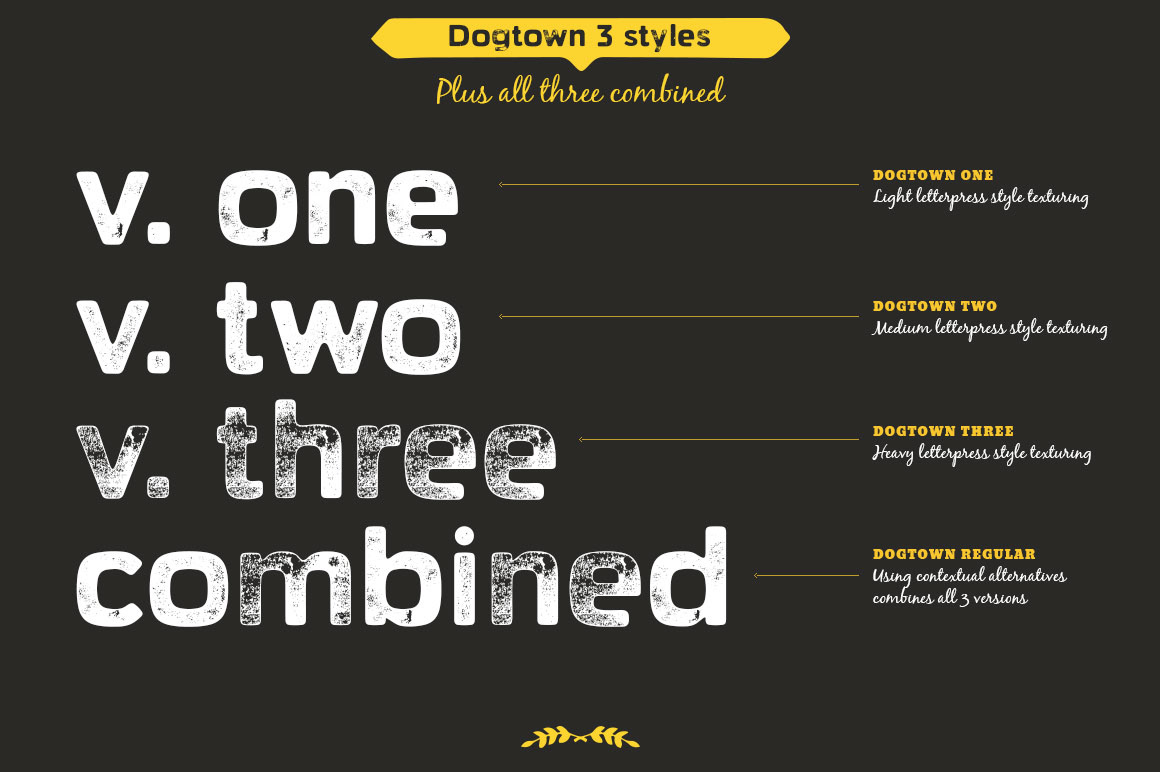 Dogtown includes three versions, four if you include the regular version that contains contextual alternatives of all the other versions. The intention was to make dogtown look more random and less repetitive, more like natural letterpress printing. It includes uppercase, lowercase, numbers, punctuation, symbols, western european, central european and South Eastern glyphs. The font format is otf. In the main regular font (with contextual alternatives) it has over 600 glyphs!